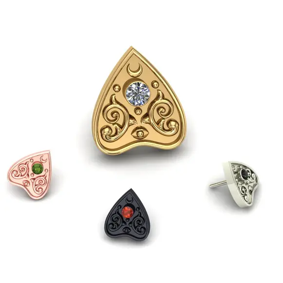 The Planchette End is inspired by the mystical and iconic design of the planchette, traditionally used in spirit boards. Often associated with the supernatural, the planchette symbolizes connection to the unknown and the spirit world. This piece brings a touch of mystery and intrigue to your body jewelry collection, appealing to those who are fascinated by the mystical and the unseen. With its detailed craftsmanship, the Planchette End offers a unique and eerie addition to your piercing style.